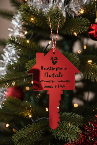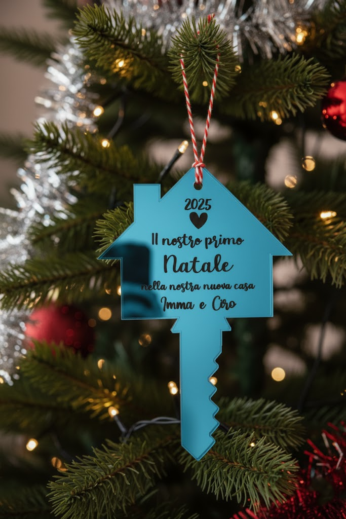 Celebra il primo Natale nella nuova casa con una pallina di Natale in plexiglass specchiato 3 mm, taglio e incisione laser. Personalizziamo nomi e anno. Disponibile in Argento, Oro, Rosso, Celeste: brillante, leggera e infrangibile, perfetta per l’albero o come regalo personalizzato.